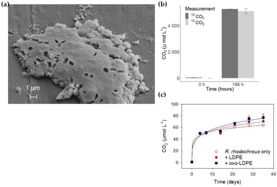 Microbial growth and measurement of biological degradation of polymer films. (a) Rhodococcus rhodochrous grown on low-density polyethylene (LDPE) underwent water washes and acid washing prior to visualisation by SEM (scale bar 1 µm). Large deposits of dead cells were clearly still visible after this treatment, revealing the challenges in the removal of bacterial films. (b) R. rhodochrous grown on 13C-glucose. There was no difference between measurement of CO2 (dark grey) or 13CO2 (light grey) after 196 h (n = 3, p = 0.98), directly linking carbon uptake with respiration. (c) Measurement of CO2 production by R. rhodochrous in minimal media (open diamond) on unaged LDPE (red circle) or unaged oxo-LDPE (blue square) revealed no significant effect due to the presence or type of plastic (n = 5, p = 0.99).