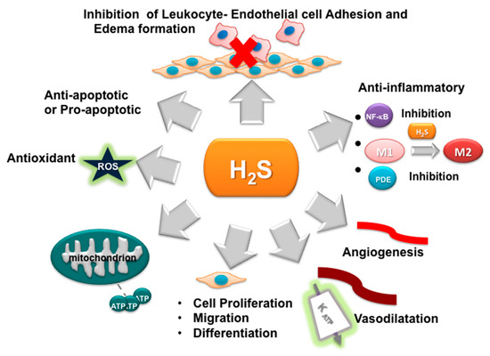 Schematic description of the effects of H2S. The anti-inflammatory effect of H2S is due to its ability to inhibit some essential pro-inflammatory transcription factors and intracellular signaling, such as nuclear factor κB (NF-κB) and phosphodiesterases (PDEs), and to improve angiogenesis through KATP channel/mitogen-activated protein kinase (MAPK) pathway activation. It inhibits the production of inflammatory cytokines and avoids the adhesion of leukocytes and endothelial cells. Moreover, the gasotransmitter can have pro- or anti-apoptotic effects depending on the cell type and its concentration. At the appropriate concentration, it is also able to have an anti-apoptotic effect due to its antioxidant properties, as well as its ability to increase the mitochondrial activity and the expression of anti-apoptotic proteins [17]. However, exogenous H2S is also able to induce apoptosis in cancer cells. H2S can also act on the vascular smooth muscle producing vasodilation. M1, macrophages M1; M2, macrophages M2; KATP, ATP-dependent K -channels.
