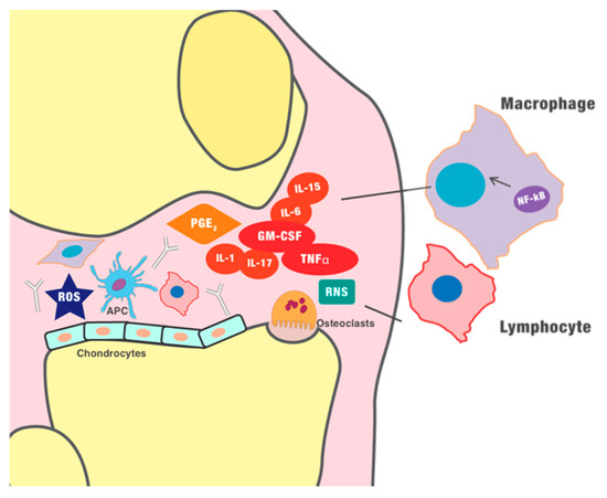 ), such as the rheumatoid factor and anti-cyclic citrullinated peptide (anti-CCP) antibodies. Furthermore, innate immunity is involved in chronic inflammation. Granulocyte-macrophage colony-stimulating factor (GM-CSF) induces the differentiation of the macrophages. Monocytes and macrophages, as well as dendritic cells, seem to play a vital role in the pathogenesis of inflammatory arthritis, as antigen-presenting cells (APCs), and they can express several pro-inflammatory cytokines. In early stages of inflammation, hypoxia and the production of ROS (reactive oxygen species) and RNS (reactive nitrogen species) seems to play a role in the initiation of the inflammatory process and induction of angiogenesis. The new blood vessels further maximize the recruitment of immune cells, amplifying the inflammatory process. The chronic inflammation finally perpetuates the production of pro-inflammatory cytokines (such as tumor necrosis factor-α (TNF-α)) and other mediators, such as prostaglandin E2, which ultimately generate vasodilation, infiltration of immune cells, and destruction of the cartilage.