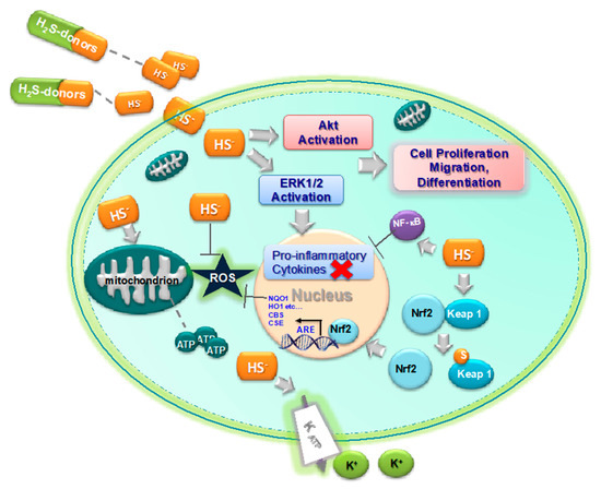 As a gasotransmitter, H2S can pass freely through cell membranes and does not require a specific receptor to mediate its effect. Only recently, H2S was considered an important signaling molecule. The biological effects of H2S are multiple and opposite, depending on its concentration. The first H2S biological effect was discovered in the vascular system, with the ability to induce the relaxation of vascular smooth muscle, causing vasodilation [16]. Despite the controversial role initially attributed to H2S, it is to date recognized that, at low concentrations, it exhibits anti-apoptotic, anti-nociceptive, cardio-protective, and blood pressure-lowering effects, while also improving angiogenesis, via the activation of KATP channels and extracellular signal-regulated kinases, such as Akt pathways [1,17,18,19,20,21,22]. Moreover, H2S shows neuroprotective and anti-inflammatory effects in general due to its antioxidant effects and inhibition of pro-inflammatory cytokines [23,24,25,26,27,28]. The potential effects of H2S were also discussed in several review articles [29,30,31,32] and are here summarized in Figure 1.