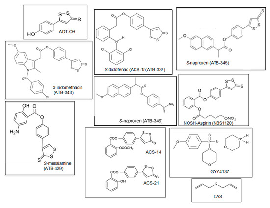 Molecular structures of slow H2S-releasing agents with potential anti-inflammatory properties for the treatment of arthritis. ADT-OH (5-(4-hydroxyphenyl)-3H-1,2-dithiole-3-thione) and ATB-429 ([4-(5-sulfanylidenedithiol-3-yl) phenyl] 5-amino-2-hydroxybenzoate) are H2S-releasing derivatives of mesalamine. ATB-337, ATB- 343, and ATB-345 are respectively diclofenac, indomethacin, and naproxen linked to a hydrogen sulfide-releasing moiety. ATB-346 is naproxen covalently linked to 4-hydroxythiobenzamide (TBZ). ACS-14 is aspirin linked to H2S donors, ACS-21 is deacetylated aspirin linked to H2S donors, and NBS1120 is a NO H2S-releasing derivative of aspirin. GYY4137—morpholin-4-ium 4 methoxyphenyl phosphinodithioate; DAS—diallyl sulfide.