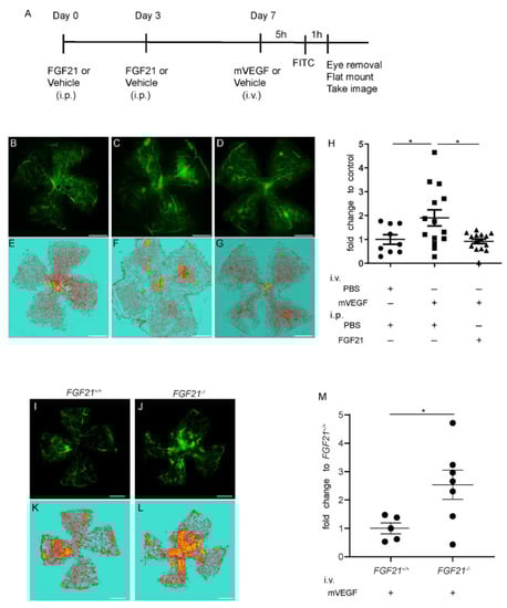 - Fu, Z.; Gong, Y.; Liegl, R.; Wang, Z.; Liu, C.H.; Meng, S.S.; Burnim, S.B.; Saba, N.J.; Fredrick, T.W.; Morss, P.C.; et al. FGF21 Administration Suppresses Retinal and Choroidal Neovascularization in Mice. Cell Rep. 2017, 18, 1606–1613. [Google Scholar] [CrossRef]