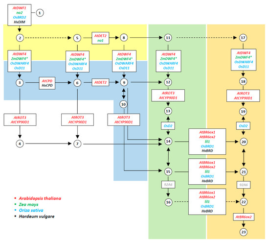 Simplified brassinosteroid (BR) biosynthetic pathway. Late C-22 oxidation, early C-22 oxidation, late C-6 oxidation, and early C-6 oxidation pathway are highlighted in yellow, blue, green, and orange, respectively. The symbols of genes encoding enzymes are represented by the arrows indicating specific reaction steps. Arrows without gene symbol are referred to by steps with uncharacterized enzymes. Dashed arrows indicate multi-enzymatic steps. The second-to-last enzymatic step of the pathway is catalysed by a putative typhasterol/6-deoxotyphasterol 2alpha-hydroxylase (92A6) that has yet not been characterized in cereals. The BR intermediates are shown as numbers within circles as follows: (1) 24-methylenecholesterol; (2) campesterol; (3) 22alpha-hydroxy-campesterol; (4) (22R,23R)-22,23-dihydroxycampesterol; (5) campest-4-en-3-one; (6) 22alpha-hydroxy-campest-4-en-3-one; (7) (22R,23R)-22,23-dihydroxy-campest-4-en-3-one; (8) 5alpha-campestan-3-one; (9) 22alpha-hydroxy-5alpha-campestan-3-one; (10) 3-epi-6-deoxocathasterone; (11) 5alpha-campestanol; (12) 6-deoxocathasterone; (13) 6-deoxoteasterone; (14) 3-dehydro-6-deoxoteasterone; (15) 6-deoxotyphasterol; (16) 6-deoxocastasterone; (17) 6-oxocampestanol; (18) cathasterone; (19) teasterone; (20) 3-dehydroteasterone; (21) typhasterol; (22) castasterone, and (23) brassinolide. (Modified after the Brassinosteroid biosynthesis—Reference pathway available at KEGG; https://www.genome.jp/kegg-bin/show_pathway?map00905).