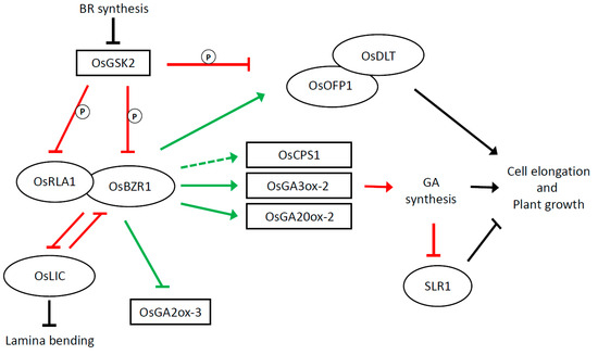 BR regulation of plant cell elongation under physiological conditions in rice. Diagram illustrates main components and type of interactions among them. GSK2 and OsBZR1 are two important actors in this pathway. GSK2 is a cGSK3-like kinase encoded by a rice orthologue of Arabidopsis BR INSENSITIVE 2 (BIN2); it targets and thus inhibits the functions of the OsBZR1 transcription factor [40] and a number of transcription factors (TFs) involved in BR response. Phosphorylation affects their nuclear localization and may suppress its activity. OsBZR1 targets gibberellin (GA) metabolic genes such as GA20ox-2, GA3ox-2, and GA2ox-3. Members of the GA20ox and GA3ox families are involved in the last steps of the synthesis of active GA, whereas GA2ox members are involved in inactivation of the biosynthesis. OsBZR1 exerts a positive effect on the first two and a negative effect on the third. The BR signal leads to the inactivation of GSK2, thus releasing the repression exerted by GSK2 on BZR1 [37,38,39,40]. OsBZR1 is thus “free” to promote GA synthesis and consequently plant growth. Promotion of GA synthesis causes the degradation of SLR1, a DELLA protein that negatively regulates GA signalling. This enhances the BR-promoting effect on plant growth. Unphosphorylated REDUCED LEAF ANGLE 1 (RLA1) interacts with OsBZR1 and enhances its transcriptional activity. DWARF AND LOW-TILLERING (DLT), a GRAS family protein, was shown to interact with OFP1 (ovate family protein 1). A dual regulation is exerted on OFP1. Its activity is enhanced at the protein level as a consequence of the GSK2 inactivation and at the transcription level because OsBZR1 binds to its promoter and induces its expression. DLT–OFP1 interaction positively regulates BR response [46]. OsLIC (LEAF and TILLER ANGLE INCREASED CONTROLLER) encodes for a C3H-type transcription factor; it interacts with and antagonizes OsBZR1 to negatively regulate BR responses [43]. It is involved in plant height as well lamina bending. Ovals represent transcription factors; rectangles indicate other proteins. Solid green and red lines indicate interaction at the transcriptional and post-transcriptional level respectively. The dotted arrow indicates that the binding at the promoter level was not shown. T lines and arrows are black if the mode of interaction is not known.