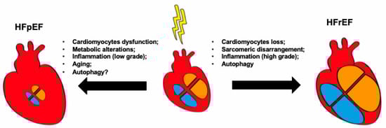 Despite the differences between HFrEF and HFpEF, inflammation is a key feature of both [72]. Interestingly, distinct patterns of inflammation can be recognized in HFrEF vs. HFpEF. In post-ischemic HFrEF, inflammatory cells orchestrate cardiomyocyte remodeling and participate in scar formation and healing processes. Cell-, tissue-, and extracellular matrix (ECM)-derived products, collectively called damage-associated molecular patterns (DAMPs), trigger an immune response which is very similar to the one induced by infection [73]. This notion underlines the similarities between different types of inflammatory response and point to common main molecular regulators. Nonetheless, the role, extent and consequences of inflammatory mechanisms in HFrEF are only partially delineated. An example of how inflammatory mechanisms interact with other biological pathways in HF, is related to autophagy. Interestingly, the interaction between these two crucial biological processes (i.e., inflammation and autophagy) seems to be bi-directional. Pro-inflammatory cytokines and DAMPs release in HF can induce autophagy in the heart and in other organs [74,75]. At the same time autophagy is essential for regulating the inflammatory mechanisms [76]. As depicted in Figure 2, although autophagy has been implicated in the pathophysiology of HFrEF (discussed in the section above), very little is known about the role of autophagy in HFpEF. Therefore, the investigation of inflammatory regulation of autophagy, and vice versa, might represent a novel area of research in HF.