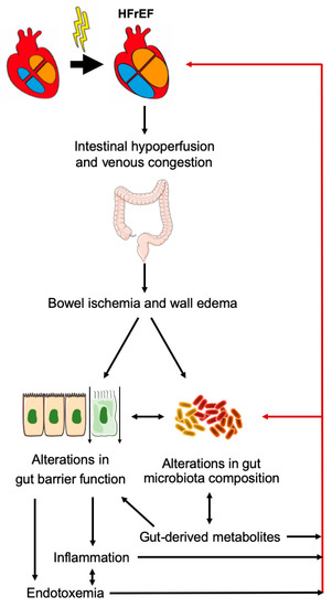 Alterations in gut barrier function and microbiota composition are emerging hallmarks of HF [82,83]. In patients with HFrEF, intestinal hypoperfusion and venous congestion determine bowel ischemia and wall edema, affecting bacterial growth and increasing intestinal permeability [84,85]. These perturbations promote a persistent low-grade inflammation in the gut, intestinal epithelial disruption and risk of endotoxemia [86]. At the same time, systemic increase in inflammatory cytokines aggravates gut permeability, promoting lipopolysaccharide (LPS) translocation and systemic inflammation [87]. Alterations in gut microbiota pathways and changes in circulating levels of metabolites, including those derived from dietary nutrients, can exert paracrine or endocrine effects and modulate HF development or progression. Collectively, these changes can aggravate HF in a vicious, self-amplifying cycle (Figure 3).