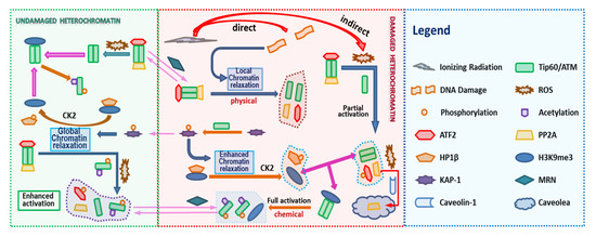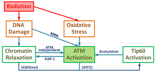 Radiation causes DNA damage including DSBs through direct ionization and the indirect effect of ROS induction or combination of these two damage mechanisms, which can affect various signal transduction pathways. DSBs cause local chromatin relaxation, triggering ATM activation by the initial activation pathway. Active ATM phosphorylates KAP-1 at the DNA damage site and phosphorylated KAP-1 spreads out throughout nucleus and induces global chromatin relaxation. Tip60 is activated by ATM-dependent phosphorylation of ATF2 and binding to H3K9me3 in the relaxed chromatin where the histone binding protein HP1 is removed by CK2 phosphorylation to release H3K9me3. Consequently, the DNA damage by IR results in the ATM acetylation by Tip60. Meanwhile, the general induction of ROS removes PP2A resulting in ATM autophosphorylation. Therefore, these two biological effects of IR contribute to ATM acetylation and phosphorylation and results in the ATM transition from dimer to monomer, leading to full ATM activation by the primary activation pathway. Moreover, chromatin relaxation is enhanced in the ATM-dependent manner. As an outline, a complete diagram of full ATM activation is given in Figure 1.