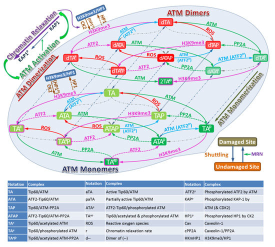 According to the working model provided in Figure 1, the ATM activation can be described as a system of biochemical reactions of ATM and other participating proteins, which has been summarized and illustrated in Figure 2 and Figure 3. The initiative activation pathway through chromatin relaxation is governed by