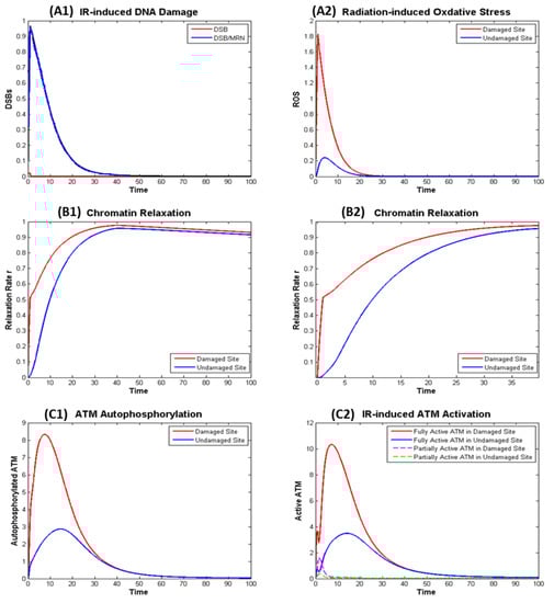Numerical simulation of the dynamics in the ionizing radiation (IR) induced ATM Activation in the Damaged and Undamaged Sites. (A) Effect of radiation: (A1) direct effect—DNA Damage; (A2) indirect effect—Oxidative Stress; (B) IR induced chromatin: (B1) kinetics of chromatin relaxation within t = 100; (B2) kinetics within t = 40 in which rapid relaxation within around t = 1 can be observed. (C) IR induced ATM autophosphorylation (C1) and (partial and full) ATM activation (C2).