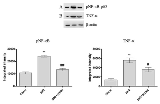 A previous experiment has already demonstrated that the expression of the phosphorylated transcriptional factor NF-κB and consequently of the pro-inflammatory cytokine TNF-α increases following IMQ administration because of an inflammatory process triggering [13]. In this experimental setting too, mice challenged with IMQ showed an enhanced expression of both pNF-κB and TNF-α. IMQ mice treated with PDRN showed a marked reduction of pNF-κB and TNF-α expression compared to untreated psoriatic animals (Figure 2A,B).