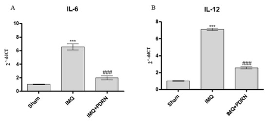 The graphs show qPCR results of Interleukins (IL)-6 (A) and IL-12 (B) mRNA expression in skin samples at day 7. IMQ application caused an increase of both IL-6 and IL-12 mRNA expression compared to Sham group. PDRN (8 mg/kg) reduced both mRNA expression. Values were obtained from 10 animals per group and are expressed as mean and SD for each group. *** p < 0.0001 vs. Sham; ### p < 0.0001 vs. IMQ.