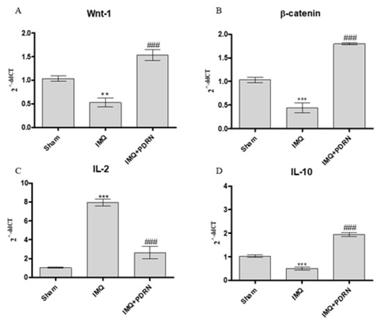 The graphs show qPCR results of Wnt-1 (A), β-catenin (B), IL-2 (C), and IL-10 (D) mRNA expression in skin samples at day 7. Mice challenged with IMQ showed a significant increase of Wnt-1, β-catenin, IL-2 and a significant decrease of IL-10 mRNA expression compared to Sham group. PDRN significantly reduced Wnt-1, β-catenin, IL-2 mRNA expression compared to IMQ group. On the contrary, PDRN treatment (8 mg/kg) caused a significant increase of IL-10 mRNA expression compared to IMQ mice. Values were obtained from 10 animals per group and are expressed as mean and SD for each group. ** p < 0.001 and *** p < 0.0001 vs. Sham; ### p < 0.0001 vs. IMQ.