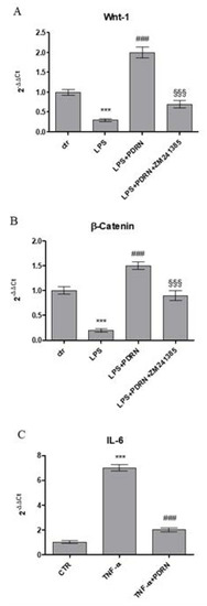 The graphs show qPCR results of Wnt-1 (A), β-catenin (B), and IL-6 (C) mRNA expression from human keratinocytes stimulated with LPS (10μg/mL) (A,B) treated with PDRN (1 μM) and with PDRN+ZM241385 (1 μM) or with TNF-α (10ng/mL) (C) treated with PDRN. Data are expressed as means ± SD. *** p < 0.0001 vs. Control (CTR); ### p < 0.0001 vs. LPS (A and B); §§§ p < 0.0001 vs. PDRN (A and B); ### p < 0.0001 vs. TNF-α (C).