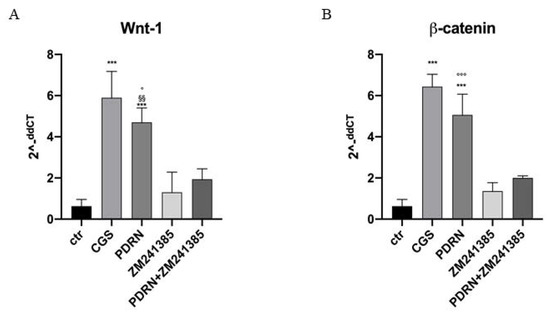 The graphs show qPCR results of Wnt-1 and β-catenin mRNA expression from human keratinocytes treated with PDRN (1 μM), CGS (1 μM), ZM241385 (1 μM) and PDRN+ZM241385 (1 μM). Data are expressed as means ± SD. *** p < 0.0001 vs. Control (CTR) and CGS vs. ZM241385; §§ p < 0.001 vs. ZM241385; ° p < 0.05 vs. PDRN+ZM241385 for the graph representing Wnt-1 expression; *** p < 0.0001 vs. CTR and ZM241385, °°° p < 0.0001 vs. PDRN+ZM241385 for the graph representing β-catenin expression.
