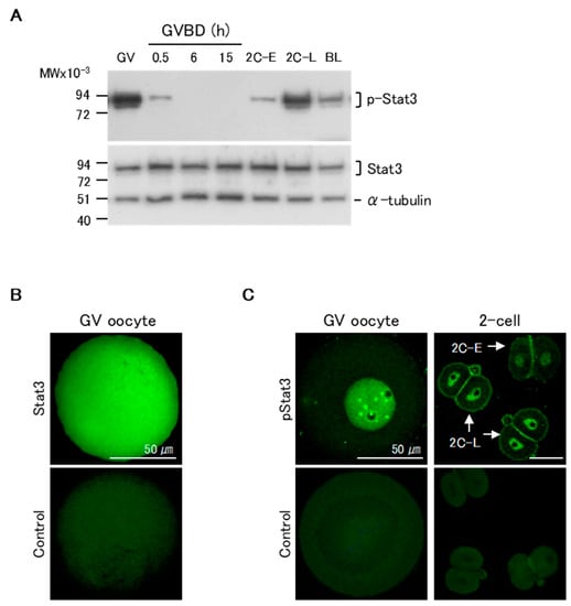 We first assessed the patterns of pStat3 expression in maturing oocytes and pre-implantation stage embryos by western blotting. pStat3 was highly expressed in GV oocytes (Figure 1A, upper panel). Following GVBD, pStat3 expression dramatically decreased at 0.5 h, and no signal was detected until 15 h of maturation, when oocytes were at the MII stage. In two-cell embryos, pStat3 expression was low at the early stage (2C-E) and high at the late stage (2C-L). pStat3 expression in GV oocytes and at 2C-L was higher than that in blastocysts, in which Stat3 is essential to maintain inner cell mass lineages []. Conversely, Stat3 protein expression was almost the same at all stages (Figure 1A, lower panel). We next examined Stat3 and pStat3 localization by immunocytochemical analysis. The non-phosphorylated Stat3 protein was ubiquitously expressed in oocytes (Figure 1B). Notably, a strong signal for pStat3 was detected in the nuclei of GV oocyte and 2C-L, but it was weak in the nucleus of 2C-E (Figure 1C); these results confirmed that the high pStat3 expression detected by western blotting reflects its localization in the nucleus at these stages.