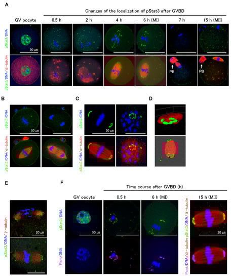 Immunocytochemical analysis showed that pStat3 accumulated in GV oocytes (Figure 2A, GV oocyte) dramatically decreased following GVBD but remained in peri-chromosomes and appeared at the microtubule asters (Figure 2A, 0.5 and 2 h). As the oocytes proceeded to metaphase I (MI), pStat3 emerged at the meiotic spindle (Figure 2A, 4 h) and was arranged at MTOCs (Figure 2A, 6 h). pStat3 was not detected at anaphase/telophase (Figure 2A, 7 h). In MII spindle, pStat3 was relocalized at the polar MTOCs (Figure 2A, 15 h). We further investigated pStat3 localization pattern in one-cell embryo. At metaphase, pStat3 was localized at MTOCs (Figure 2B, left panels), consistent with its localization in MI and MII spindles (Figure 2A, 6 and 15 h). pStat3 was not detected at anaphase (Figure 2B, right panels), which is consistent with results in maturing oocytes at anaphase/telophase (Figure 2A, 7 h). pStat3 localized at MTOCs showed a ring-shaped pattern (Figure 2C), which was further confirmed by 3D reconstruction and surface rendering using Imaris (Figure 2D). Considering the pStat3 localization at MTOCs, double-staining immunocytochemistry with γ-tubulin or pericentrin was performed. Diffusely expressed γ-tubulin was co-localized with pStat3 at MTOCs in MI (Figure 2E, upper panel) and MII spindles (Figure 2E, lower panel). We examined pStat3 and pericentrin co-localization patterns in GV to MII oocytes. Pericentrin was not detected in the nucleus of the GV oocyte (Figure 2F). However, at 0.5 h following GVBD, pericentrin emerged around the chromosomes and microtubule asters (Figure 2F, 0.5 h) and was subsequently localized at MTOCs in MI (Figure 2F, 6 h) and MII spindles (Figure 2F, 15 h). Pericentrin expression pattern was consistent with pStat3 expression pattern in maturing oocytes. These findings suggest that γ-tubulin, pericentrin, and pStat3 are the components of MTOCs and are involved in meiotic spindle assembly during oocyte maturation.