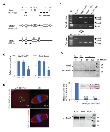 Stat3-deficient mice exhibit embryonic lethality after implantation (E 7.0) []. Consequently, a conditional strategy such as the use of the Cre-loxP system is required to create genetically knocked out maternal Stat3 (Stat3−/−) oocytes. Cre driver mice, such as Zp3-Cre or Gdf9-Cre transgenic (Tg) mice, are commonly used for the conditional expression of Cre recombinase in oocytes. In Zp3-Cre Tg mice, Cre expression is induced early in growing oocytes at the primary or the secondary follicular stages [,]. Oocytes with conditionally deleted Stat3 showed normal maturation, fertility, and pre-implantation development [,]. Thus, maternal Stat3 expressed before Cre likely remains functional in Stat3−/− oocytes.