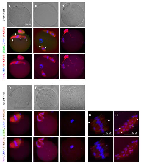 As the Stat3 protein in Stat3−/− oocytes is presumably functional, we next explored the effect of pStat3 inhibition by using small-molecule inhibitors, stattic and BP-1-102, and anti-pStat3 antibody. Stattic selectively inhibits Stat3 activation and dimerization via the reduction of Y705 phosphorylation []. Similarly, BP-1-102 blocks Y705 phosphorylation and dimerization in a dose-dependent manner []. We performed oocyte in vitro maturation (IVM) for 15 h in a culture medium supplemented with stattic or BP-1-102. In both cases, the frequency of abnormal MII oocytes increased in a dose-dependent manner (Table 1). Following stattic treatment, the first polar body (PB) emission was significantly decreased at 3 μM and entirely inhibited at 4 μM, confirming the identical sensitivity of Stat3+/+ and Stat3−/− oocytes to stattic. Immunocytochemical analysis revealed abnormal phenotypes even in some apparently normal MII oocytes that emitted the first PB after treatments (Figure 4A–C). We classified the phenotypes into several patterns and observed chromosomal aberrations in all cases. For example, spindle microtubules were elongated rather than being arranged in a barrel configuration (Figure 4A,H); multiple spindle bodies were formed, each being involved chromosomes (Figure 4B); spindles were shortened and showed incorrect assembly (Figure 4C,G); a relatively larger PB containing an expanded spindle was formed (Figure 4D); or two PBs were formed without spindle assembly (Figure 4E). As shown in Figure 4F, at a higher concentration of inhibitors, i.e., 4 μM stattic (Stat3+/+ and Stat3−/− oocytes) and 16 μM BP-1-102 (Stat3+/+ oocytes), all oocytes exhibited a dark color (data not shown) and aggregated chromosomes without spindle formation. In all cases, pStat3 was absent or detected as a faint signal at an incorrect location concomitantly with pericentrin (Figure 4A,B,G,H). In some cases, only pericentrin was detected at the asters (Figure 4C,E) and in the aggregated chromosomes (Figure 4F). We further studied the effect of pStat3 inhibition via microinjection of anti-pY705 antibody. The results are shown in Table 2. Compared to PBS and IgG isotype control, the antibody significantly increased the frequency of abnormal MII oocytes. As shown in Figure 4, the phenotype was the same as that obtained with inhibitor treatments. Overall, these findings show that pStat3 is essential for meiotic spindle assembly and chromosome segregation.
