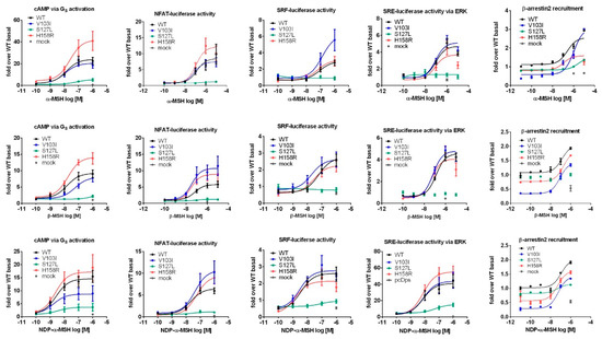 The loss-of-function mutant S127L was clearly impaired in every tested pathway when challenged with α-MSH. Treatment with AgRP showed a trend towards reduced antagonistic potency, which was again not significant.