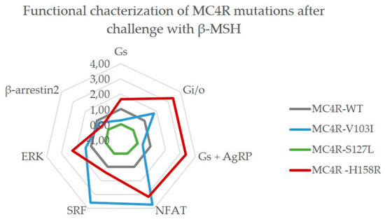 2.3.2. Challenge with β-MSH Results in a Different Activation Pattern Compared to α-MSH for MC4R V103I and H158R Mutations