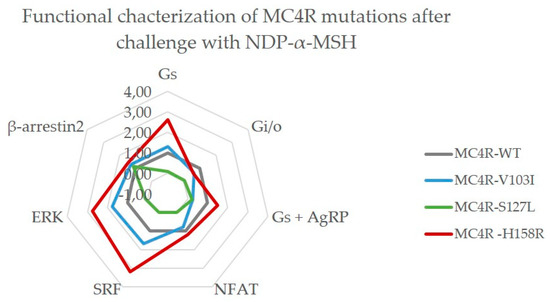 Functional characterizations of MC4R mutations are usually performed with the endogenous agonist α-MSH in most published studies. We characterized MC4R mutations V103I, S127L and H158R in all mentioned pathways with this ligand and identified that all three mutations showed clear signaling biases towards particular pathways (Figure 4).