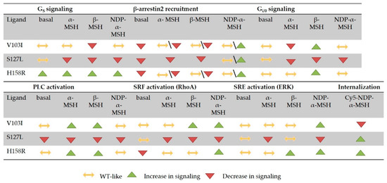 Summary of all functional data for the MC4R mutations V103I, S127L and H158R. This figure gives a crude overview of the differences in signaling profiles between the mutations, but also between the three tested ligands. Signaling is indicated as either decreased or increased when bias value deviated ≥0.5 bias values from the MC4R WT. For β-arrestin2 recruitment, the bias value differences were below 0.5, but statistically significant when analyzed with two-way ANOVA, followed by Dunnett’s post-hoc test.