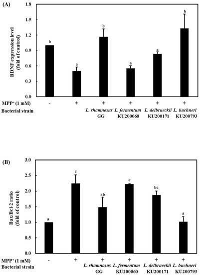 Bax (Bcl-2-associated X protein), which influences outer membrane permeability, promotes the releases of cytochrome C from the inter membrane of the mitochondria and, finally, induces apoptosis [38]. Bcl-2 (B-cell lymphoma) has antiapoptotic properties and stabilizes membrane permeability, thus preserving mitochondrial integrity, suppressing the release of cytochrome C, and inhibiting apoptosis [39]. Cell survival depends on the balance between pro- and antiapoptotic proteins of the Bcl-2 family. The Bax/Bcl-2 ratio is a better indicator of apoptosis than the absolute concentration of either Bax or Bcl-2 [40]. To investigate the neuroprotective effect of CM in SH-SY5Y cells, Bax and Bcl-2 gene expression levels were evaluated by RT-PCR analysis (Figure 3B). Bax/Bcl-2 mRNA expression ratio increased to 2.3-fold following 1 mM MPP+ treatment compared to that in the negative control. However, L. buchneri KU200793 significantly decreased the Bax/Bcl-2 ratio to almost normal levels (by 1.0-fold). L. rhamnosus GG, L. fermentum KU200060, and L. delbrueckii KU200171 decreased the ratio by 1.5-, 1.9-, and 2.2-fold, respectively. These results indicate that L. buchneri KU200793 was effective in protecting MPP+-induced cell apoptosis. The extract of the traditional herb Gastrodia elata blume has been shown to effectively reduce the Bax/Bcl-2 mRNA expression ratio in MPP+-treated cells. Importantly, pretreatment decreased the Bax/Bcl-2 mRNA expression ratio by 1.5-fold [31]. Compared with previous results, L. buchneri KU200793 effectively attenuated apoptosis.