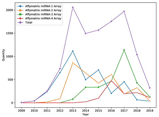 DNA microarray is a popular high throughput technology for miRNA expression profiling. Despite the fact that technology passed the peak of its popularity in 2017, it is still widely used in miRNA research (e.g., see Figure 1 for information about the yearly amount of Affymetrix miRNA Array data published in Gene Expression Omnibus (GEO) [1]).