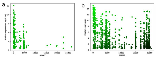 MIMAT number vs expression level. (a) scatter plot showing relation between MIMAT number and -transformed median expression value for all miRNAs from TCGA miRNA-seq data with RPM value greater than 10; (b) the same plot for all miRNAs from microarray data. Color of point indicates score value: green points correspond to high scores and black points correspond to low scores.