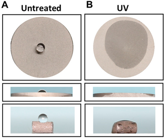 Converted hydrophilicity of acid-etched titanium disk and implant surface. (A) Hydrophobic surface of untreated acid-etched disk and implant. (B) Hydrophilic surface obtained by photofunctionalization (UV-treated), on which water immediately spread across the surface.