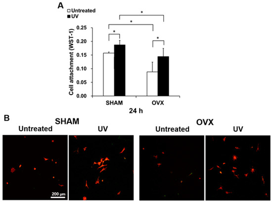 Cell attachment of osteoblasts from sham and OVX groups on acid-etched titanium surfaces with or without UV. (A) Number of attached cells after 24 h-incubations evaluated by WST-1 assay. (B) Initial spread of osteoblasts at 24 h after seeding on titanium surface. Representative confocal microscopy images of cells stained with rhodamine phalloidin for actin filaments (red) and anti-vinculin for vinculin (green). Each value represents the mean ± standard deviation from triplicate experiments (n = 3). * p < 0.05, significant between untreated and photofunctionalized surfaces. Scale bar = 200 µm.