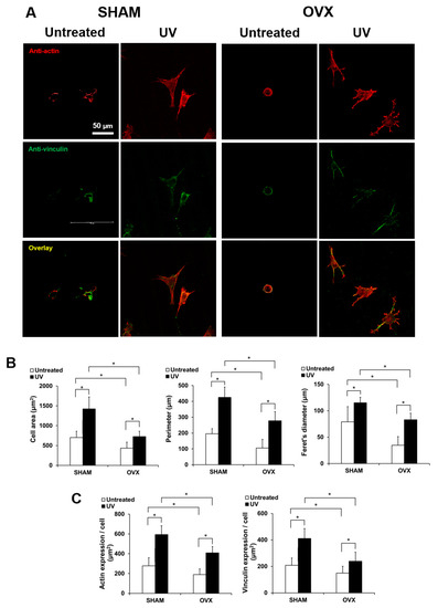 Representative confocal microscopy images of the spreading behavior of osteoblasts from sham and OVX groups at 24 h after seeding on untreated and photofunctionalized titanium surfaces. (A) Confocal microscopic images of osteoblast following immunochemical staining for cytoskeletal actin and adhesion protein vinculin are shown. Scale bar = 50 µm. (B) Histograms for cytomorphometric parameters measured from the images. (C) The expression levels of actin and vinculin were semiquantified using the confocal microscopy images. Data are mean ± standard deviation from triplicate experiments (n = 3). * p < 0.05, significant between untreated and photofunctionalized surfaces.