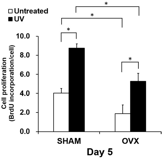 Proliferative activity of osteoblasts from sham and OVX groups on untreated and photofunctionalized titanium surfaces. 5-Bromo-2′ deoxyuridine (BrdU) incorporation into DNA during mitosis standardized by cell number. BrdU incorporation into DNA measured on day 5. Each value represents the mean ± standard deviation from triplicate experiments (n = 3). * p < 0.05, significant difference between untreated and photofunctionalized surfaces.