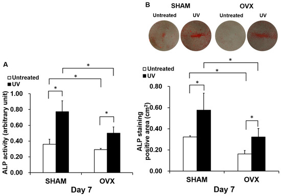 UV light-enhanced alkaline phosphatase (ALP) activity, an early- to middle-stage marker of osteoblasts, in the OVX and sham groups. (A) Colorimetrically quantified ALP activity standardized per cell at day 7 is shown. (B) ALP activity measured as the ALP-positive (red) area at day 7. Representative images of the stained culture are presented on the top. The ALP-positive area measured from the images is presented at the bottom histogram in square centimeters. Each value represents the mean ± standard deviation of triplicate experiments (n = 3). * p < 0.05, significant difference between untreated and UV light-treated surfaces.