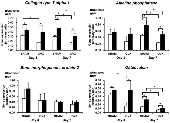Gene expression levels of selected markers quantified by real-time qPCR. The osteogenic markers collagen type I alpha 1, alkaline phosphatase, bone morphogenetic protein-2, and osteocalcin were analyzed. Total RNA was isolated at 3 and 7 days from osteoblastic cell cultures on acid-etched titanium surfaces with or without UV-treatment. Relative expression levels (2−ΔΔCt values) of the genes of interest were normalized to that of the housekeeping gene Gapdh. Each value represents the mean ± standard deviation of triplicate experiments (n = 3). * p < 0.05, significant difference between untreated and UV light-treated surfaces.