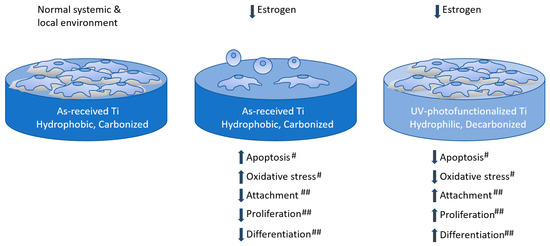 Scheme illustrating the proposed effect underlying the enhancement of attachment, proliferation, and differentiation of osteoblasts by UV-photofunctionalization in osteoporosis model. “#” and “##” indicates the associated strength.
