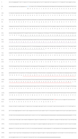 - Larkin, M.A.; Blackshields, G.; Brown, N.P.; Chenna, R.; McGettigan, P.A.; McWilliam, H.; Valentin, F.; Wallace, I.M.; Wilm, A.; Lopez, R.; et al. Clustal W and Clustal X version 2.0. Bioinformatics 2007, 23, 2947–2948. [Google Scholar] [CrossRef]