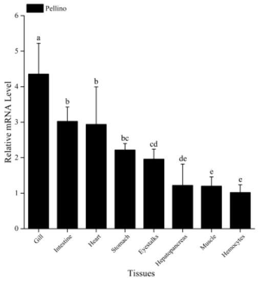 Tissue distribution of MjPellino mRNA expression in healthy M. japonicus. The expression levels in the gill, intestine, heart, stomach, eyestalks, hepatopancreas, and muscle were normalized to that in hemocytes. Each bar represents the mean ± SD (n = 6). A significant difference between groups (p < 0.05, ANOVA) is indicated by different letters (a, b, c, d and e) above the bars.