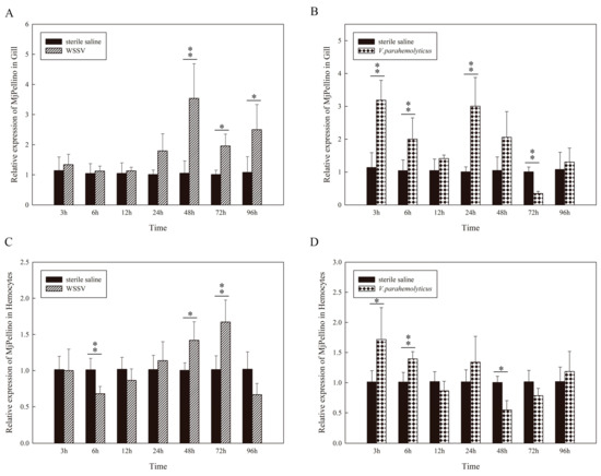 Shrimp gills and hemocytes are important tissues involved in immune defense [30]. In this study, the expression profiles of MjPellino in the gills and hemocytes after challenge with WSSV and V. parahaemolyticus were selected for further detection (Figure 3A–D). According to the results, the expression of MjPellino was significantly affected by these two pathogens, and the effect increased with time over a certain duration after injection. The results showed that both WSSV and one serious intracellular pathogen, V. parahaemolyticus, could upregulate MjPellino expression in these two tissues within a certain time period after the challenge compared with the levels detected in the sterile saline control. In the WSSV-challenged M. japonicus gills, MjPellino expression began to markedly increase at 24 hpi and peaked at 48 hpi (3.5-fold increase) (Figure 3A). In contrast, MjPellino expression in the hemocytes of M. japonicus increased gradually from 6 to 72 hpi, peaked at 72 hpi (1.7-fold increase), and was downregulated at 96 hpi (0.7-fold decrease) after the WSSV challenge (Figure 3B). In response to V. parahaemolyticus, MjPellino expression in the gills abruptly increased until reaching a peak of 3.2-fold at 3 hpi and showed periodic expression (Figure 3C), and similar findings were obtained in hemocytes (Figure 3D). The results showed that the levels and changes in MjPellino mRNA expression in M. japonicus were similar to those obtained for Pellino mRNA expression in Litopenaeus vannamei after challenge with V. parahaemolyticus [31]. The control group, which was injected with sterile saline, did not show any obvious change in MjPellino expression.