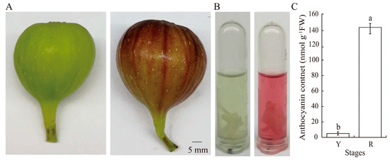 Fig coloration and the anthocyanin contents in yellow and red stages. (A) Fig fruits in Y and R stages. Scale bar = 5 mm. (B) The colors of anthocyanin extraction in Y and R stages. (C) The anthocyanin contents in Y and R stages. Y and R represent yellow (the beginning of the turning stage) and red (the stage when the fruit just developed to the marketable mature stage) stages in Figure (A–C), respectively. The different small letters represent significant differences (p < 0.05).