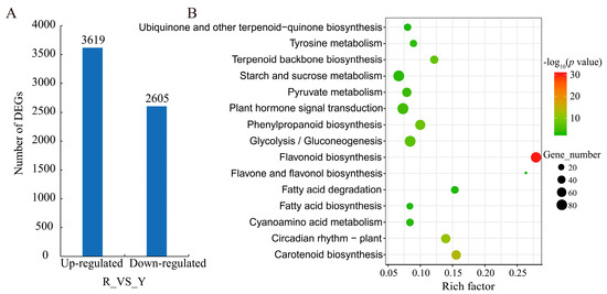 The number and KEGG classification of DEGs. (A) DEGs between R and Y stages. R and Y represent fig fruits in the yellow and red stages, respectively. (B) The top 15 enriched KEGG pathways of DEGs. The rich factor indicates the ratio of DEGs to the total number of genes in the same pathway. DEGs, differentially expressed genes; KEGG, Kyoto encyclopedia of genes and genomes.