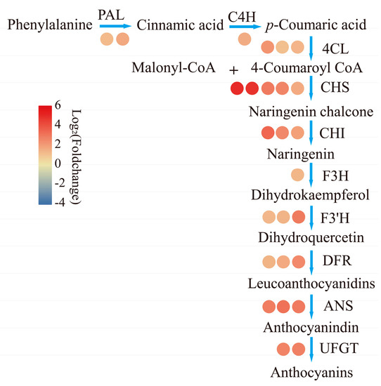 Expression profile of anthocyanin related structural genes. The number of circles represents the gene number and the colors of circle represents the value of log2(Foldchange). PAL, phenylalanine ammonium lyase, Cluster-11055.80692, Cluster-11055.82174; C4H, cinnamic acid 4-hydroxylase, Cluster-11055.80529; 4CL, 4-coumaroyl CoA ligase, Cluster-11055.83506, Cluster-11055.81897, Cluster-11055.111791; CHS, chalcone synthase, Cluster-11055.103287, Cluster-11055.148622, Cluster-11055.62221, Cluster-11055.71506, Cluster-11055.81810; CHI, chalcone isomerase, Cluster-11055.10763, Cluster-11055.145351, Cluster-11055.79888; F3H, flavanone 3-hydroxylasel, Cluster-11055.81147; F3’H, flavanone 3′-hydroxylase, Cluster-11055.77085, Cluster-11055.79806, Cluster-11055.82169; DFR, dihydroflavonol reductase, Cluster-11055.59172, Cluster-11055.59175, Cluster-11055.146588; ANS, anthocyanidin synthase, Cluster-11055.79464, Cluster-11055.79498, Cluster-11055.79715; UFGT, UDP-glucose: flavonoid 3-O-glucosyltransferase, Cluster-11055.59183, Cluster-11055.59184.