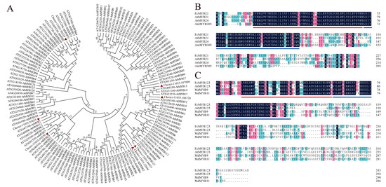 Phylogenetic analysis of fig and Arabidopsis R2R3-MYB proteins and multiple sequences alignment of FcMYB21 and FcMYB123. (A) Phylogenetic analysis of fig and Arabidopsis R2R3-MYB proteins. The red triangles represent the R2R3-MYB proteins of fig. (B) Multiple sequences alignment of FcMYB21. (C) Multiple sequences alignment of FcMYB123. Identical residues are shown in black, conserved residues in pink (≥ 75%) and similar residues (≥ 50%) in blue in Figure (B,C). The red and blue lines represent the R2 and R3 motif in Figure (B,C), respectively. AtMYB21 (Arabidopsis thaliana, AT3G27810.1), AtMYB24 (Arabidopsis thaliana, AT5G40350.1), AmMYB305 (Antirrhinum majus, P81391.1); AtMYB123 (Arabidopsis thaliana, AT5G35550.1), MdMYB9 (Malus × domestica, DQ267900); MdMYB11 (Malus × domestica, DQ074463).