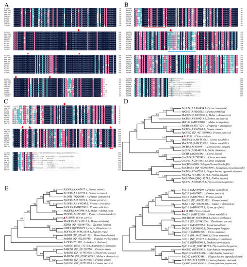 Multiple sequences alignment and phylogenetic analysis of FcCHS1, FcDFR1, and FcCHI1. (A) Multiple sequences alignment of FcCHS1. (B) Multiple sequences alignment of FcDFR1. The red and blue lines represent NADP binding region and substrate binding region, respectively. The red asterisk represents the key residue in the determination of the substrate specificity of FcDFR1. (C) Multiple sequences alignment of FcCHI1. (D) Phylogenetic analysis of FcCHS1. (E) Phylogenetic analysis of FcDFR1. (F) Phylogenetic analysis of FcCHI1. The red asterisks represent the conserved active site and the red dots mean catalytic residues in Figure (A,C). Identical residues are shown in black, conserved residues in pink (≥ 75%) and similar residues (≥ 50%) in blue in Figure (A–C). FcCHS1, FcCHI1 and FcDFR1 protein of fig were marked with red triangles in Figure (D–F), respectively. CHSs of mosses and Lycophyte, BEN1 proteins and mosses CHIs were used as outgroups in phylogenetic analysis of FcCHS1, FcDFR1 and FcCHS1 in Figure (D–F), respectively. CHS, chalcone synthase; CHI, chalcone isomerase; DFR, dihydroflavonol reductase, BEN1, BRI1-5 ENHANCED 1. MnCHS1 (Morus notabilis, AHY35308.1), MnCHS2 (Morus notabilis, AHY35309.1), MdCHS (Malus × domestica, BAB92996.1), MtCHS (Malus toringoides, DV29810.1), FaCHS (Fragaria × ananassa, BAE17124.1), PaCHS (Prunus avium, AJO67963.1), PcCHS (Pyrus communis, AAX16494.1), DzCHS1 (Durio zibethinus, XP_022721946.1), TcCHS1 (Theobroma cacao, XP_007034442.1); MnDFR (Morus notabilis, AHY35315.1), DzDFR (Durio zibethinus, XP_022769017.1), PpDFR (Prunus persica, AJA79073.1), MdDFR (Malus × domestica, AAO39816.1), CsDFR (Citrus sinensis, NP_001275860.1), EgDFR (Eucalyptus grandis, XP_010060970.1), JcDFR (Jatropha curcas, XP_012071899.1), FaDFR (Fragaria × ananassa, AHL46451.1), QsDFR (Quercus suber, XP_023872028.1); MnCHI (Morus notabilis, AHY35310.1), JrCHI (Juglans regia, XP_018828033.1), QsCHI (Quercus suber, XP_023904011.1), DlCHI (Dimocarpus longan, AEO36980.1), MdCHI (Malus × domestica, XP_008386466.1), PpCHI (Prunus persica, XP_007218371.1), CsCHI (Citrus sinensis, NP_001275866.1), ZjCHI (Ziziphus jujube, XP_015877049.1), PmCHI (Prunus mume, XP_008233532.1). The gene IDs and species are in the brackets of phylogenetic analysis.