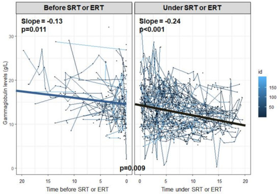 The evolution of gammaglobulin levels and the impact of GD treatment were assessed by linear/logarithmic mixed models for patients who received treatment. Slopes were calculated for two periods—before and after starting ERT or SRT—and the impact of the treatment was assessed by using an interaction term between period (before or after GD treatment) and time. Regressions of the monoclonal component were described, as was the occurrence of malignant hemopathies.