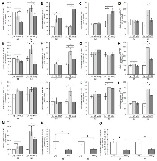 Gene expression of various proteins from the vascular endothelial growth factor (VEGF) signaling pathway. Results show relative mRNA transcription levels from (A) VEGFA, (B) FLK1, (C) FLT1, (D) RAF1, (E) SRC1, (F) AKT1, (G) FAK1, (H) MTOR, (I) RICTOR, (J) MAP2K1, (K) ERK1, (L) ERK2, and (M) LCN2 genes. Results are shown as percentages of 3-day and 5-day 1 g controls. Time-resolved immunofluorometric assay (TRIFMA) results show amounts of (N) NGAL and (O) VEGF proteins in the supernatant taken from 3-day and 5-day flasks containing PC-3 cells, shown as percentages of 3-day and 5-day 1 g controls. * p < 0.05.