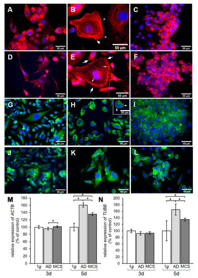 Investigation of the cytoskeleton. F-actin visualized by means of phalloidin and immunofluorescence (IF) staining for β-actin. F-actin pictures show (A) 3-day 1 g control, (B) 3-day AD, (C) 3-day MCS, (D) 5-day 1 g, (E) 5-day AD, and (F) 5-day MCS. Big arrows in (B) and (E) point to lamellipodia, notched arrows in (B) point to filopodia, and small arrows in (E) point to stress fibers. β-actin pictures show (G) 3-day 1 g control, (H) 3-day AD, (I) 3-day MCS, (J) 5-day 1 g, (K) 5-day AD, and (L) 5-day MCS. Arrows in (H) point to membrane blebbing. Relative mRNA transcription levels of (M) ACTB and (N) TUBB genes in 3-day and 5-day samples were analyzed by qPCR. * p < 0.05.