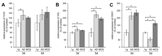 TLN1 gene expression was upregulated mRNA level after 3 days in AD, but not in MCS compared to 1 g, whereas after 5 days no significant changes were measured (Figure 5A). The mRNA expression of VCL was significantly elevated in AD and MCS samples compared to 1 g controls. This elevation of VCL was further enhanced after 5 days in both AD and MCS (Figure 5B). Moreover, the CDH1 gene expression was clearly upregulated after an RPM-exposure in 3-day AD and MCS samples. In contrast, the CDH1 mRNA expression was downregulated in AD after 5 days, while the CDH1 level was still upregulated in MCS compared to both 1 g and AD (Figure 5C).