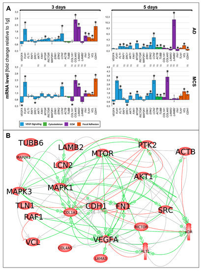 The various genes analyzed by qPCR (Figure 6A) were differentially regulated in µg samples (AD and RPM). Figure 6A presents a summary of the qPCR data, already described in Figure 2, Figure 3, Figure 4 and Figure 5, and gives a comparable overview on the results. A closer look at the 3-day samples reveals that most genes involved in VEGF signaling (blue bars) are upregulated in AD samples compared to 1 g, while the gene expression in MCS presents a more heterogeneous pattern. Notably, VEGFA, FLK1, and LCN2 are equally regulated in AD and MCS samples after 3 days. After a 5-day RPM-exposure, most of the investigated VEGF signaling molecules are significantly upregulated in AD samples. In comparison, 5-day MCS samples presented a significant regulation, which is in contrast to 3-day samples. Remarkably, VEGFA is not regulated in 5-day AD samples compared to 1 g. In addition, LCN2 is strongly upregulated in all conditions. The cytoskeletal molecules of interest (green bars) are not regulated after 3 days. However, after 5 days, both conditions are upregulated. The investigated ECM molecules (violet bars) after a 3-day RPM-exposure present a comparable image in AD and MCS samples. After 5 days, AD cells show a heterogeneous expression image, while LAMB2 is strikingly upregulated. In MCS, however, collagens are clearly enhanced, while LAMB2 is not changed compared to the controls. Genes of the focal adhesion molecule complex (orange bars), especially CDH1 mRNA, are highly upregulated in both 3-day conditions. Even though CDH1 is still significantly upregulated, it seems to be reduced in 5-day conditions.