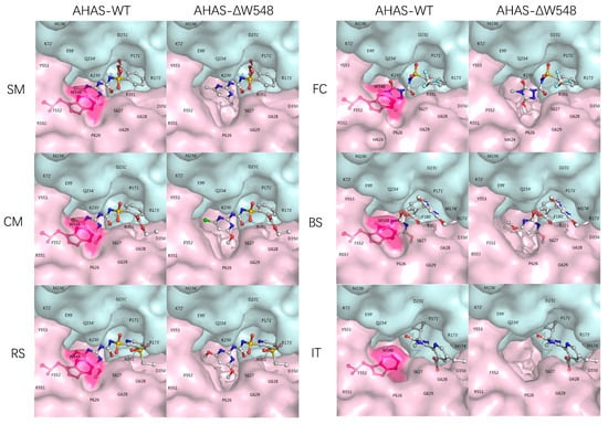 Herbicide tolerance was generated when some mutations weakened the binding between AHAS and an herbicide []. A SU/PYB herbicide was bound to the W548 with a π-π interaction [,]. When the W548 was replaced with a non-aromatic residue, the π-π interaction disappeared and herbicide tolerance was generated [,]. Herbicide tolerance also occurred when the W548 was replaced with other aromatic residues []. The benzene ring in tyrosine or phenylalanine changed the orientation and dihedral angle, reducing the π-π interaction. The AHAS channel varied its conformation to the herbicide binding []. The loss of the π-π interaction of the AHAS-ΔW548 was supposed to change the protein’s conformation. This variation might shift the herbicide position and allow substrates access to the active center. The BS induced the cleavage of a thiazolium ring, which reduced the cofactor content and binding affinity []. It was the largest molecule in all tested herbicides and occupied more space in the channel. This occupation could cause the reduction of the reaction velocity of the AHAS-ΔW548. The binding between IT and AHAS caused a negative effect on the active site []. This effect might decrease binding affinity and the passing speed of substrates.